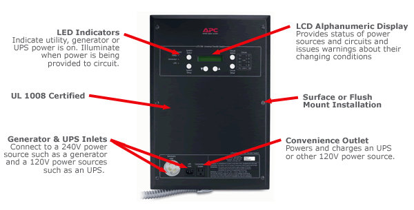The Universal Transfer Switch by American Power Conversion offers a wide variety of user-programmable features that put you in charge of exactly what the system will power in the event of an electrical outage.