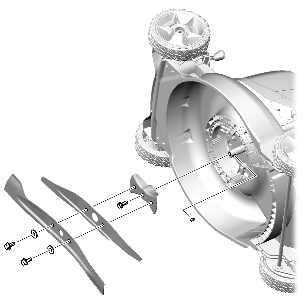 Before removing the twin blades, disconnect the spark plug (for gas models) or the battery (for electric models). Tip the mower on its side with the fuel cap side up for gas mowers. Use a socket wrench to loosen bolts, and note the blade orientation for replacement.