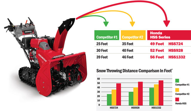When it comes to snow, well, Honda blows away the competition. Literally. The combination of the Honda GX Series commercial grade engine, optimized impeller pulley, and 90 degree impeller wing dramatically optimizes the HSS Series’ snow throwing capacity, outperforming many competitors.